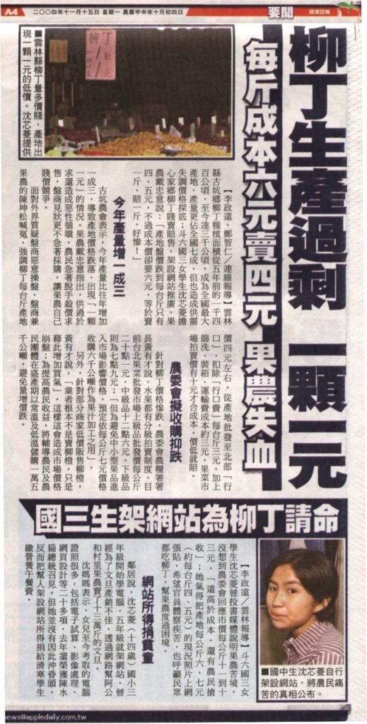 程、如何挑選柳丁、栽種管理等,並藉這個網站為農民發聲。