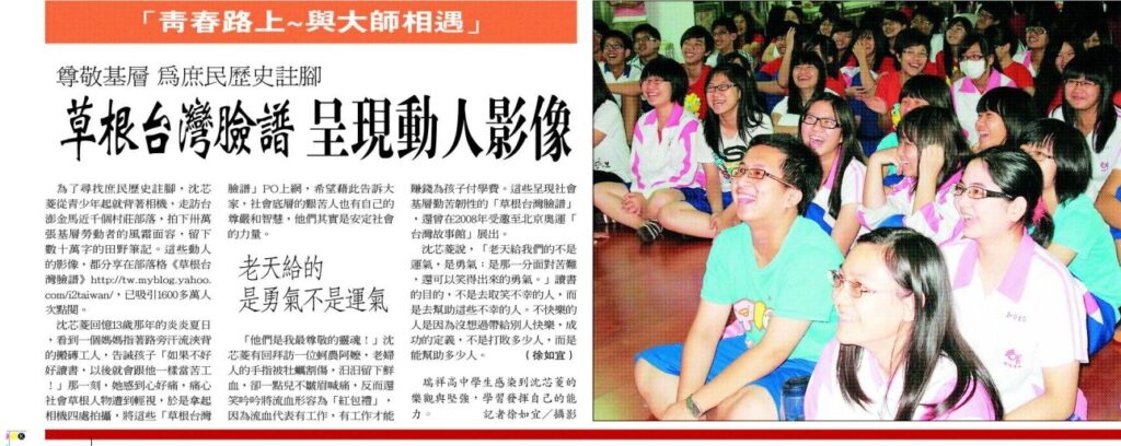 為了尋找庶民歴史注腳,沈芯菱從青少年起就背著相機,走訪台澎金馬近千個村莊部落,拍下州萬張基層勞動者的風霜面睿,留下數十萬字的田野筆記。這些動人的影像,都分享在部落格草根台灣臉譜已吸引1600多萬人大點開,沈芯菱回憶童年的炎炎夏日,看到一個媽媽指著路旁汗流浹背的搬磚工人,告誡孩子如果不好好讀書,以後就會跟他樣當苦工!」那一刻,她感到心好痛,痛心社會草根人物遭到輕視,於是拿起相機四處拍攝,將這些「草根台灣臉譜」PO上網,希望藉此告訴大家,社會底層的艱苦人也有自己的尊嚴和智慧,他們其實是安定社會的力量老天給的是勇氣不是運氣「他們是我最尊敬的靈魂!」沈芯菱有回拜訪一位蚵農阿嬤,老婦人的手指被牡蠣刮傷,汨汨留下鲜血,卻一點兒不皺眉喊痛,反而還笑吟吟將流血形容為「紅包禮」因為流血代表有工作,有工作才能賺錢為孩子付學費。這些呈現社會基層勤苦韌性的「草根台灣臉譜」,還曾在2008年受邀至北京奥運「台灣故事館」展出,沈芯菱說,「老天給我們的不是運氣,是勇氣:是那一分面對苦難,運可以笑得出來的勇氣」讀書的目的,不是去取笑不幸的人,而是去幫助這些不幸的人。不快樂的人是因為沒想過帶給別人快樂,成功的定義,不是打收多少人,而是能幫助多少人。