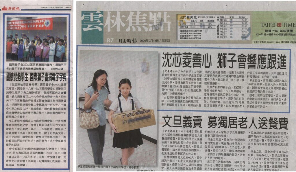 去年總統教育獎得主斗六高中學生沈芯菱,將獎金購買電子字典贈送嘉義原住民小學,發揮拋磚引玉效果,國際獅子會300A1專區獅友們集資購買528台電子字典,13日贈送給縣內國中小學貧困學生。台北市同興獅子會會長賴永昌表示,去年他接獲沈芯菱網路訂單,表示要購買電子字典,剛開始只覺得沈芯菱很會殺價,後來才知道沈芯菱是利用總統教育獎的獎金購買電子字典,要送給原住民小學,讓他相當感動。原籍古坑鄉的賴永昌,西螺高中畢業後就到台北工作,事業穩定,意外發現同鄉沈芯菱小小年紀,就積極幫助貧苦學子,想到自己也有能力回饋故鄉,所以在今年8月發起這項捐贈活動,結果共獲得528台電子字典的捐贈,其中包括遠見科技贊助的100台電子字典。賴永昌說,這項捐助以縣內國小3年級至國中,低收入戶、單親家庭、隔代教養家庭及家庭發變故致經濟困難的學生為限。應邀出席的沈芯菱說,這次捐贈活動她只扮演穿針引線的角色,希望這些子字對受學生未來的學習路途有助益。