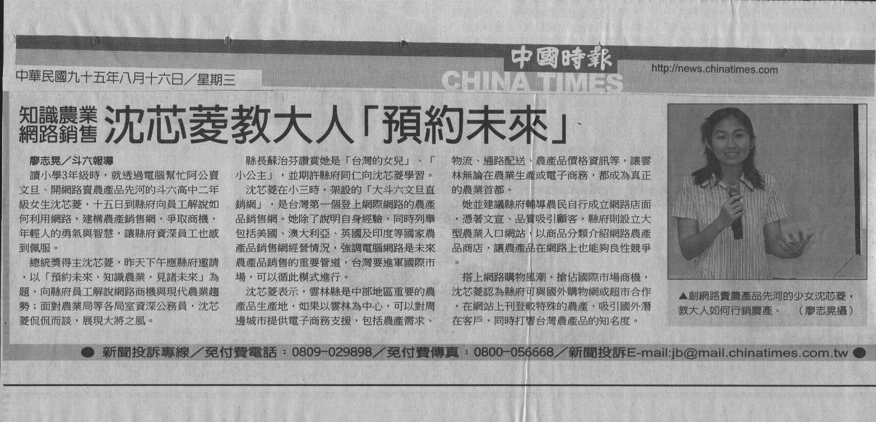 讀小學3年級時,就透過電腦幫忙阿公賣文旦、開網路賣農產品先河的斗六高中二年級女生沈芯菱,十五