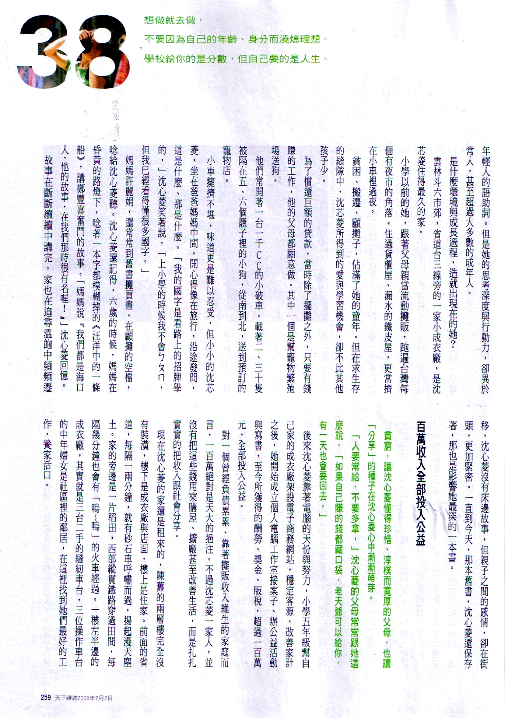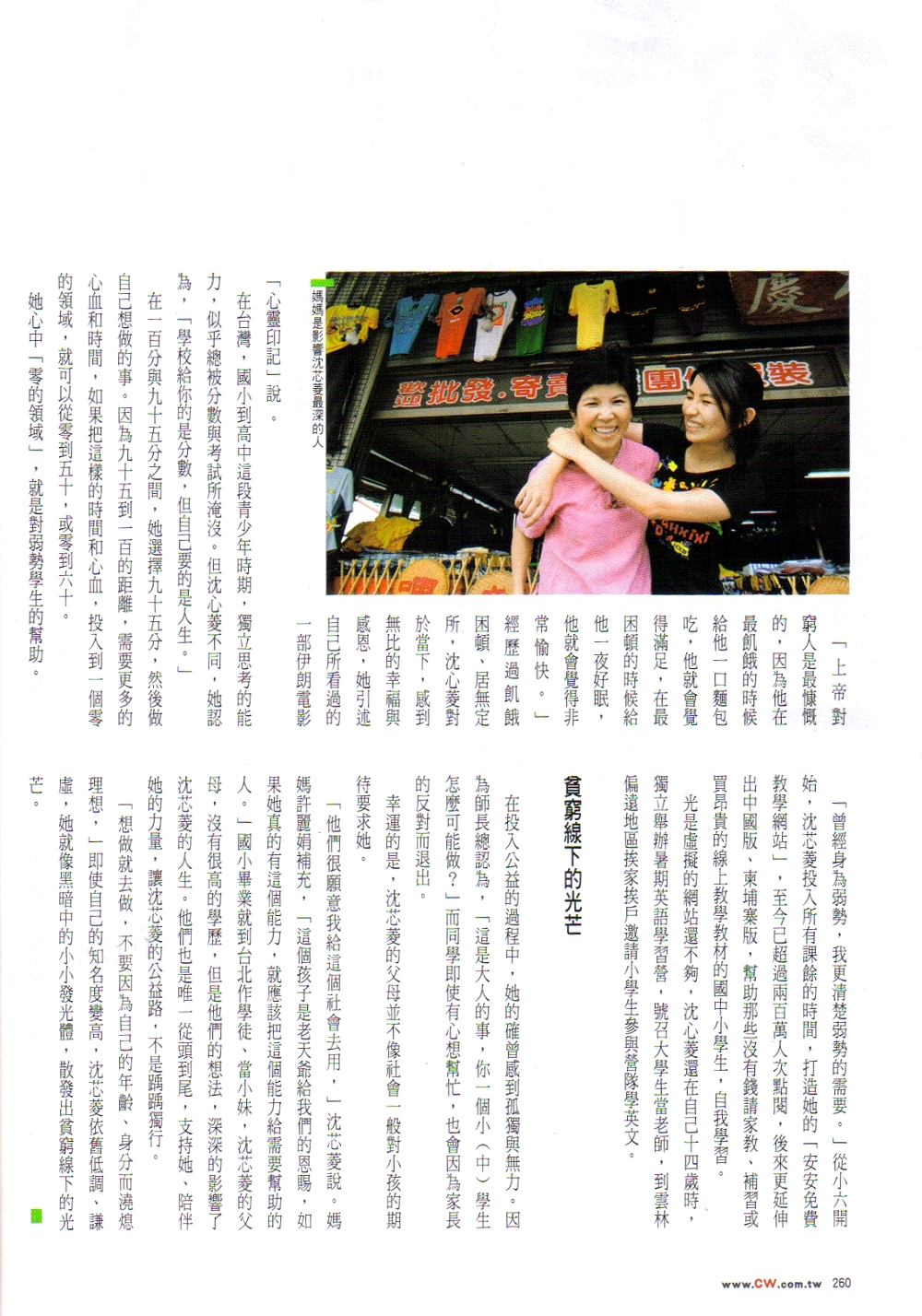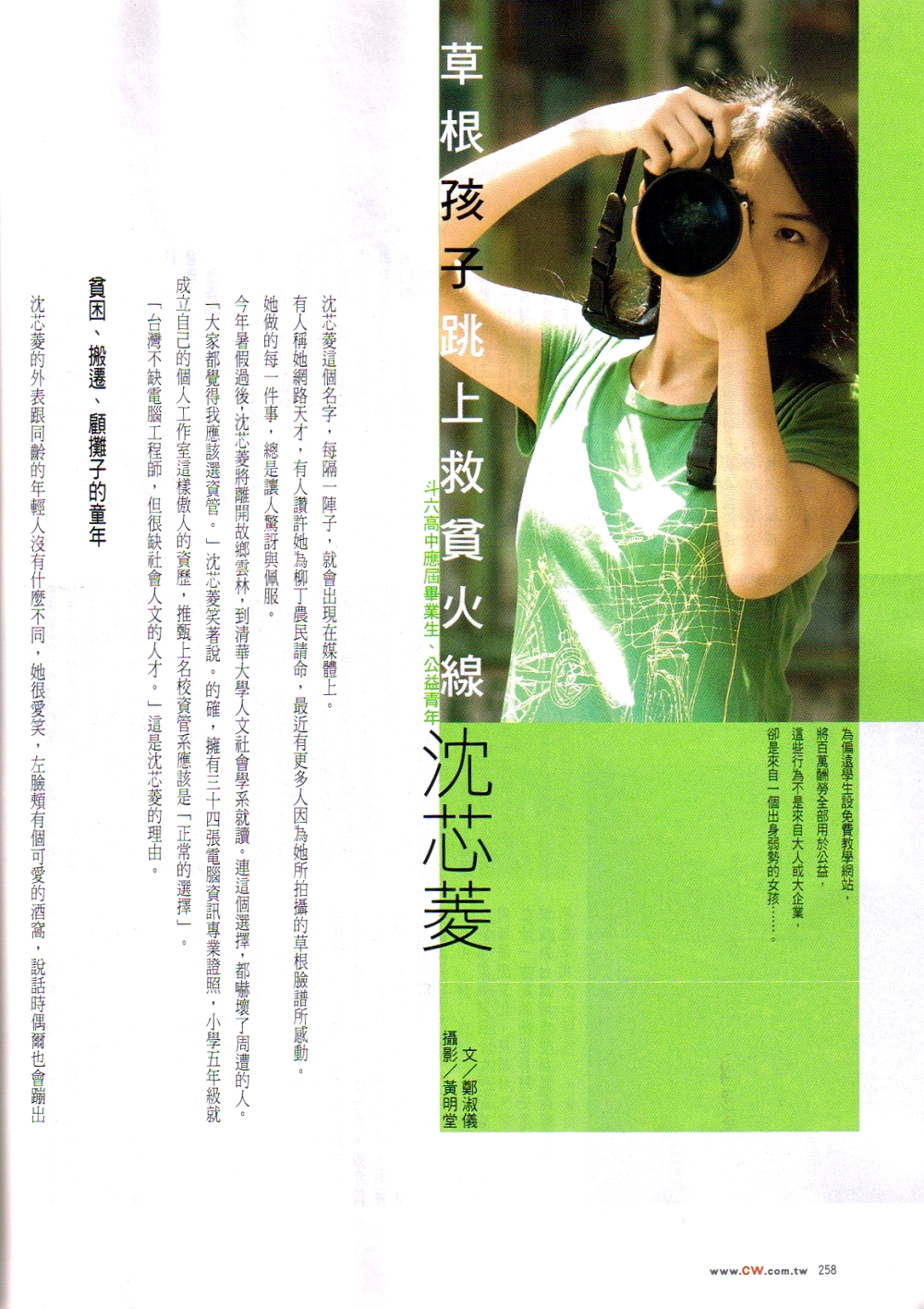 「想做就去做,不要因為自己的年齡、身分而澆熄理想,」即使自己的知名度變高,沈芯菱依舊低調、謙虛,她就像黑暗中的小小發光體,散發出貧窮線下的光芒。