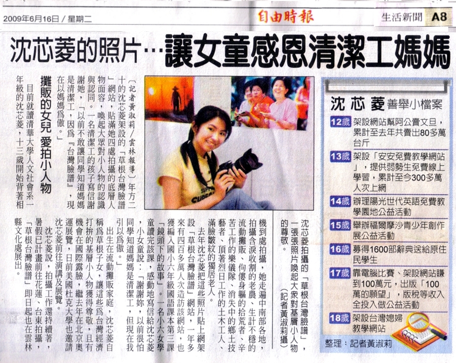 年方二十的沈芯菱架設的「草根台灣臉譜」網站,貼滿她四處拍攝的底層人物面容,喚起大眾對小人物的認識與認同。一名清潔工的孩子寫信謝謝她,「以前不敢讓同學知道媽媽是清潔工,因為『台灣臉譜』,現在以媽媽為傲。」